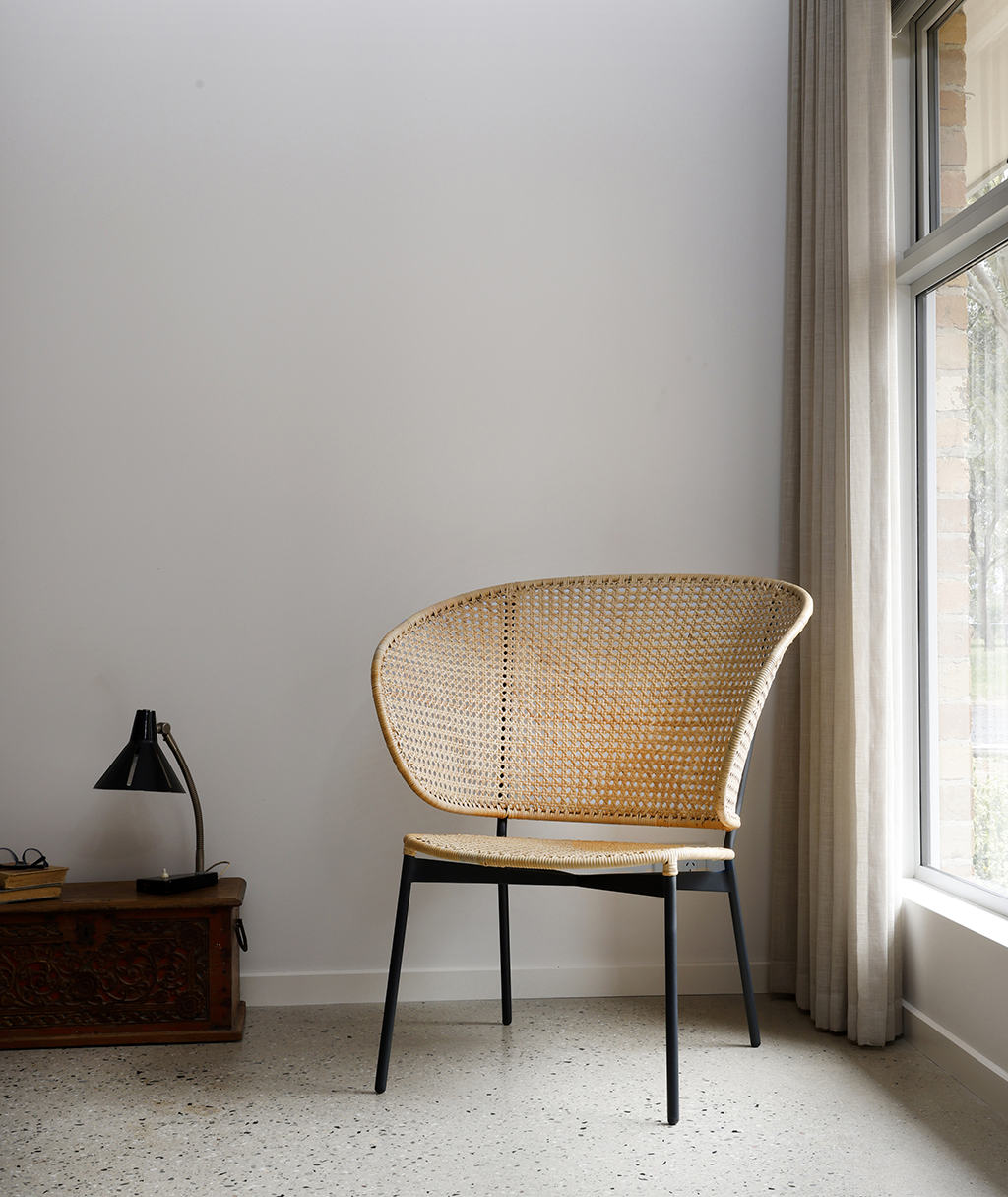 Characterised by its curvaceous backrest and elegant demeanour, Gorm's components seamlessly unite to form a piece that is poised and balanced. An intricately woven shell allows a delightful interplay of light and shadow, resulting in a range that is eye-catching from any angle. The subtle elasticity of the handwoven components combined with a generous backrest nurture the user and offer refuge. Designed by Allan Nøddebo, Gorm is a sophisticated woven classic that will remain relevant for decades to come. The Gorm range includes a dining chair, lounge chair, highback chair, barstools and an ottoman. Available in natural rattan shell for indoor use and polyethylene shell for outdoor use.