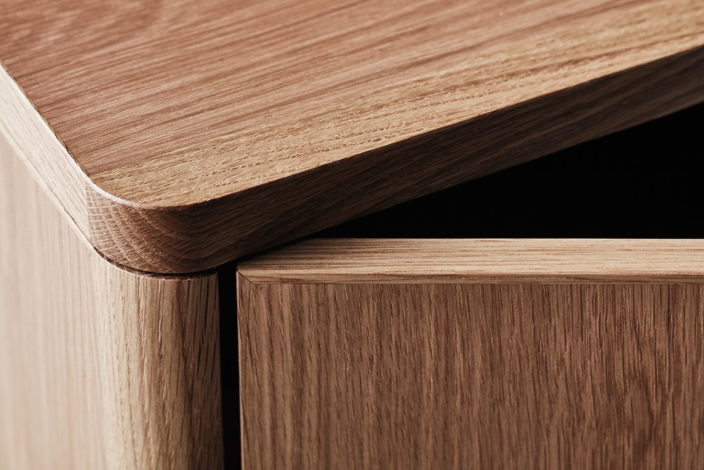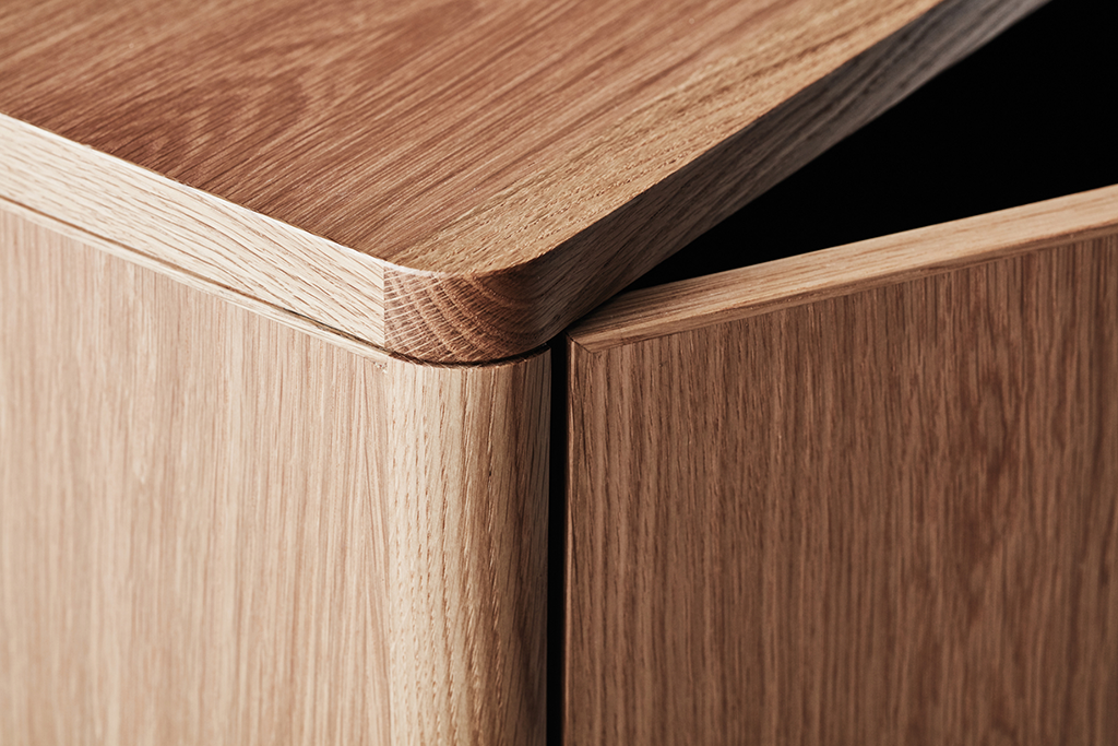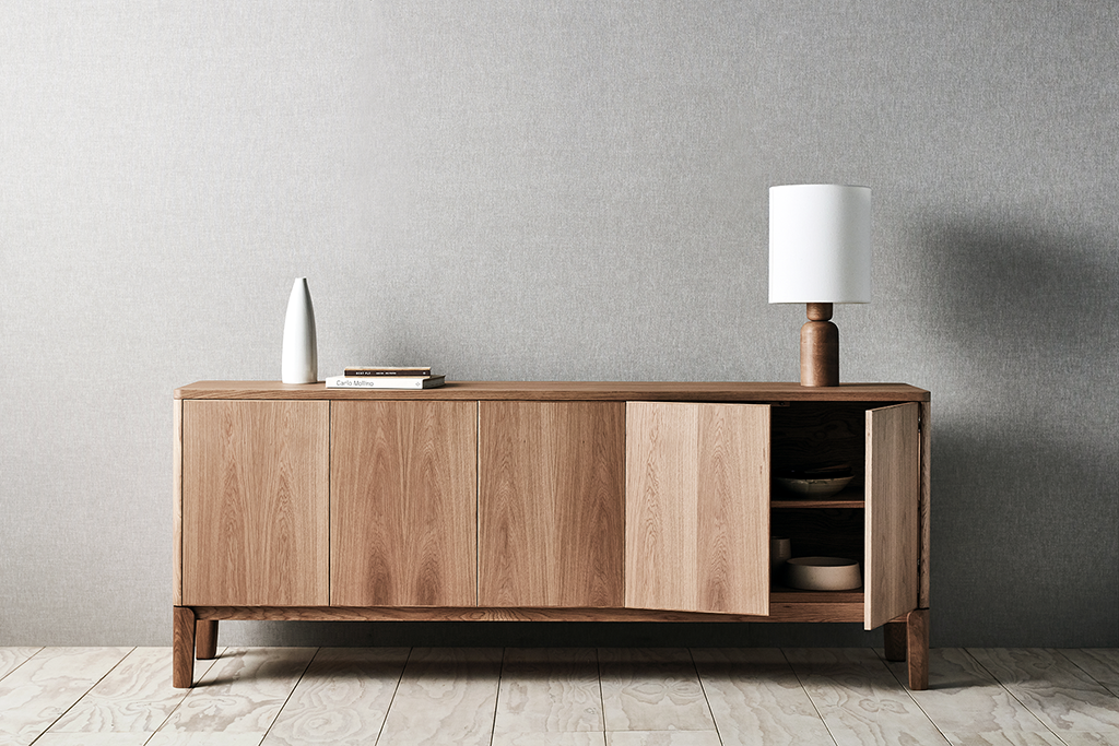 The Polly Sideboard is a versatile cabinet with a refined timeless aesthetic. The sideboard shows design cues from the rest of the Polly range including subtle rounded corners and a unique leg detail. Available as standard with five push-release cupboard doors, however the cabinet can be customised to suit your storage requirements. Available in our usual selection of timbers and finishes. Shown here in American Oak with a Natural Oil finish.