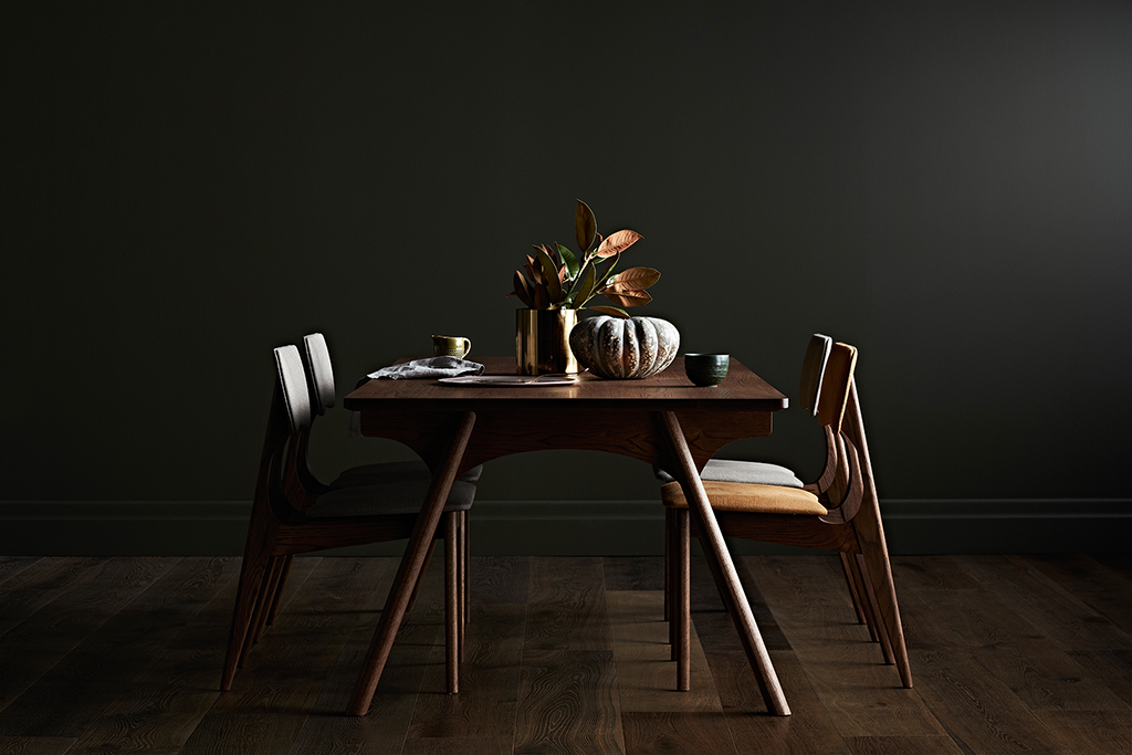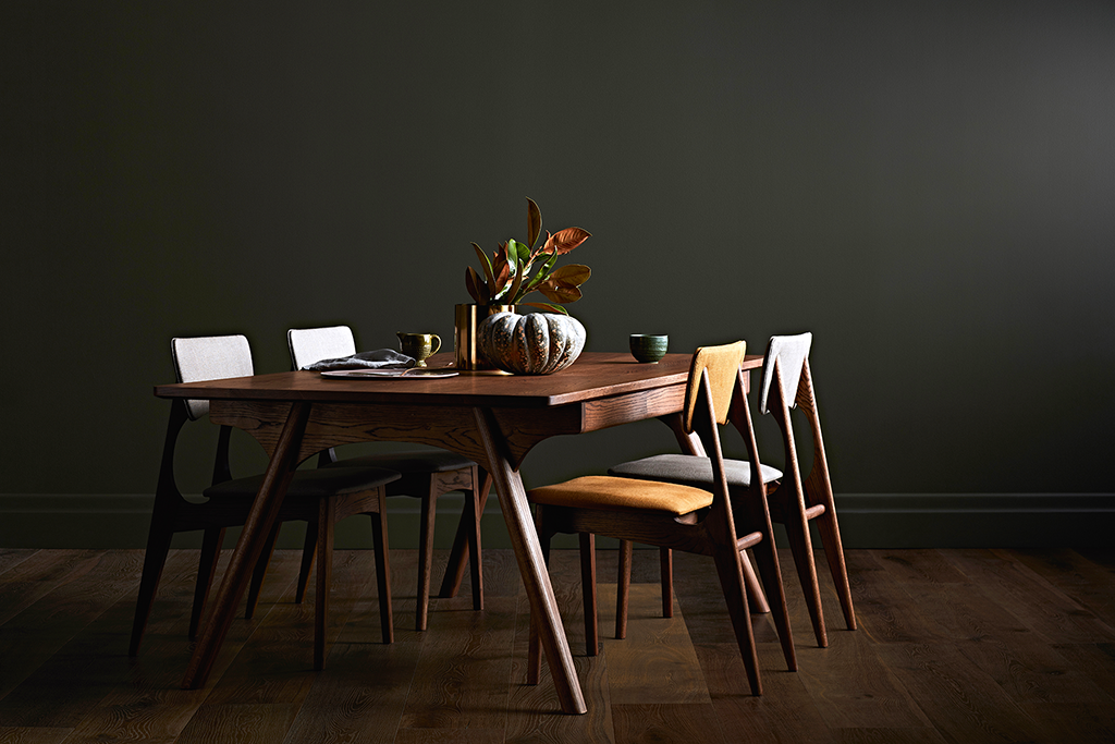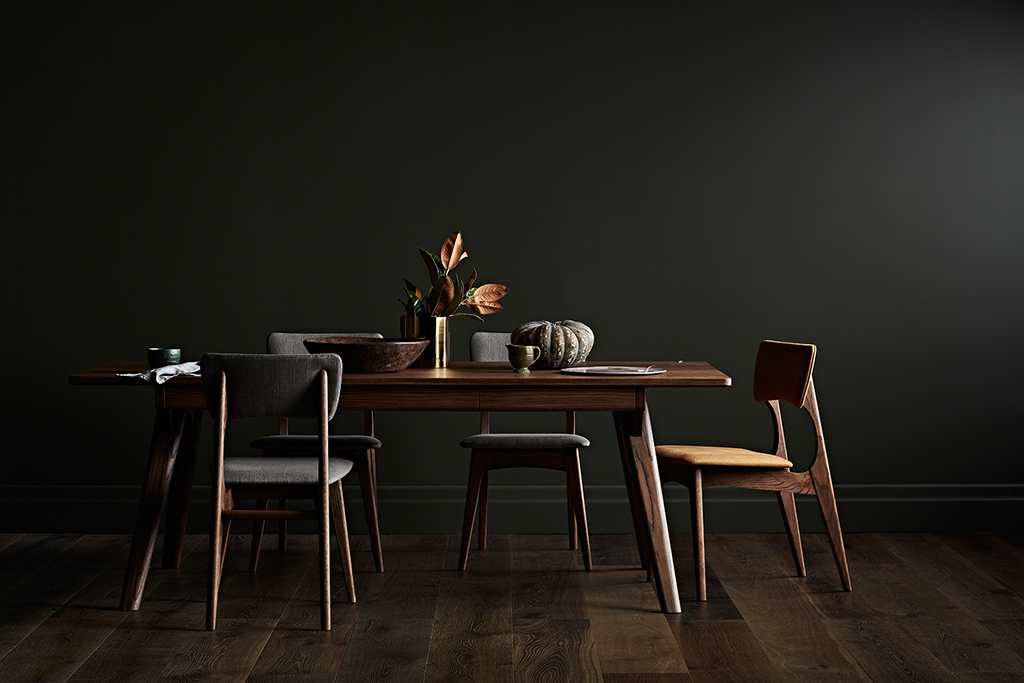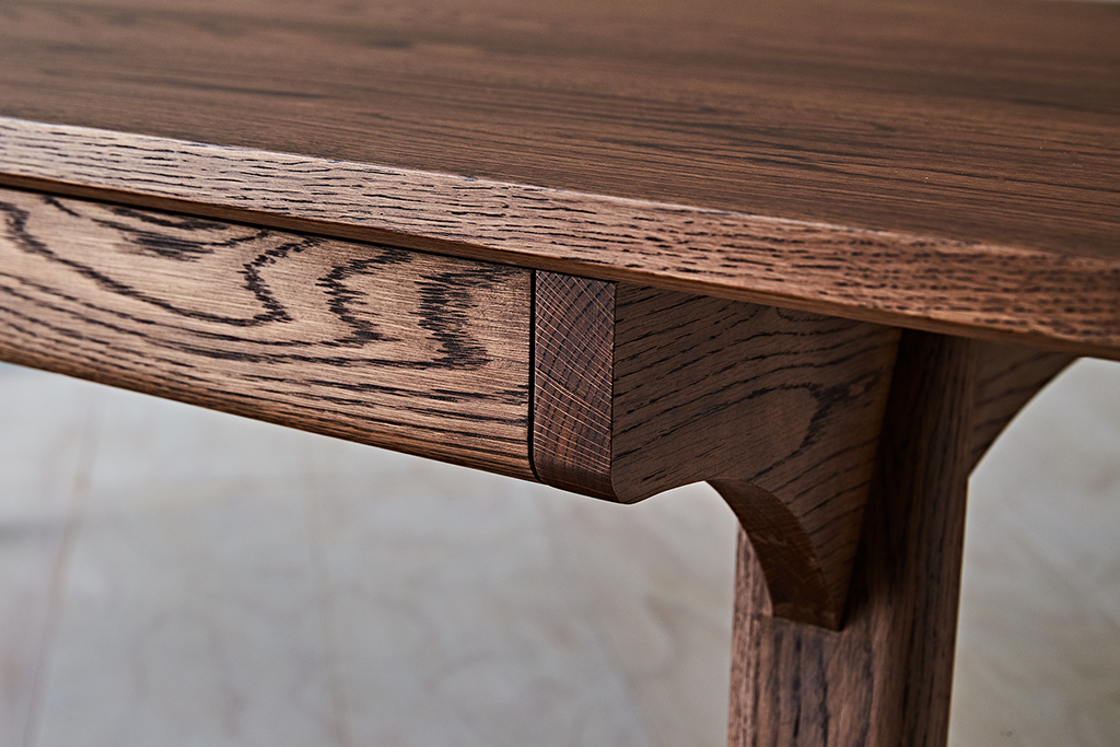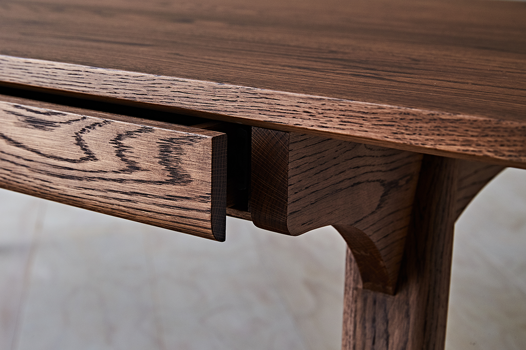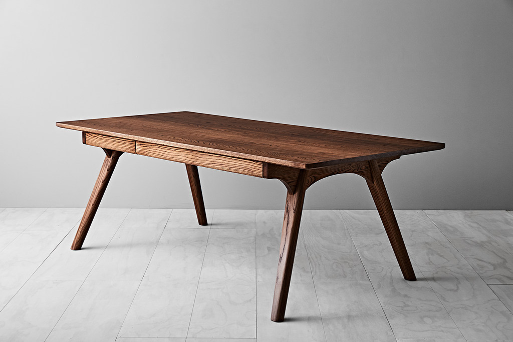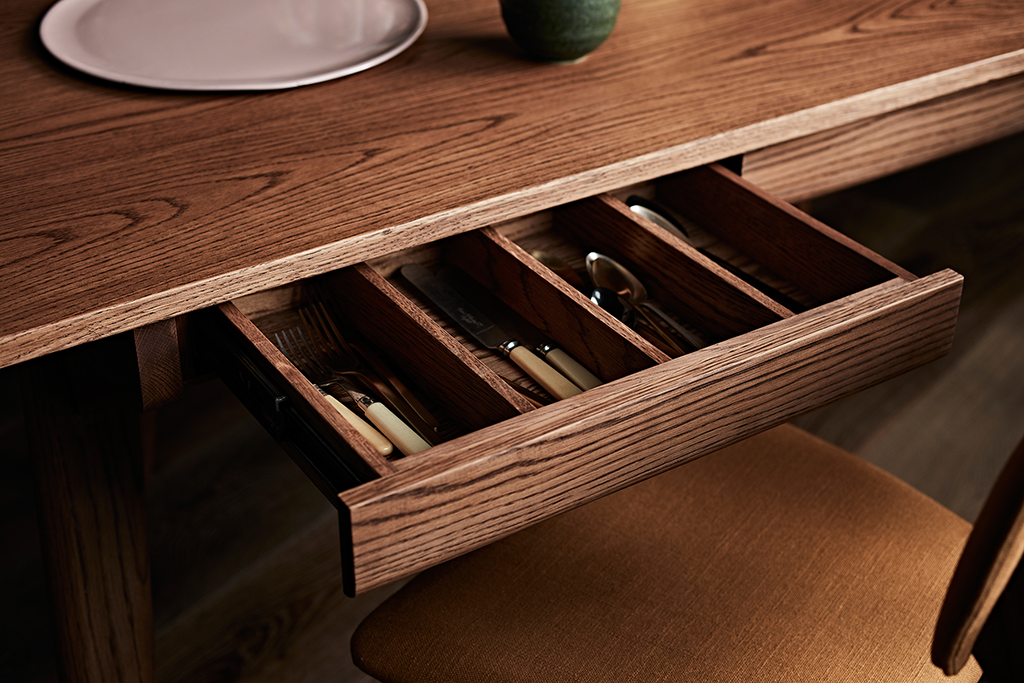 An accentuated leg angle combined with an organic heavily shaped end rail provide the dramatic look. The Rima table has an option of six drawers to provide added versatility, whether it is day to day cutlery, electronic devices, or old fashioned pen and paper.Rima is designed to be a functional dining table, but is equally suitable as a grand desk, with cable routing options available.