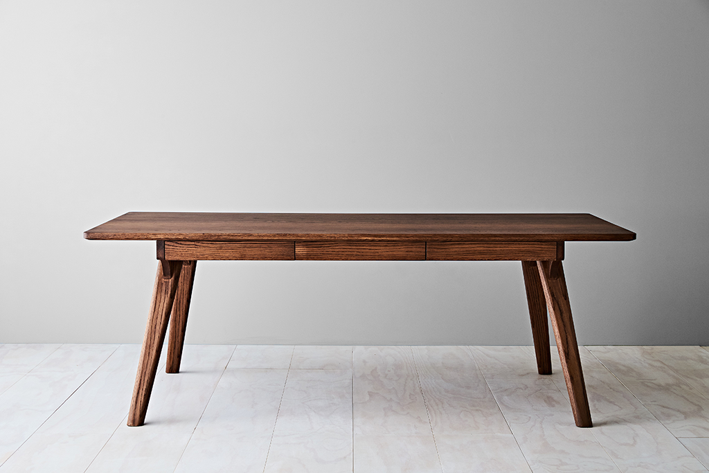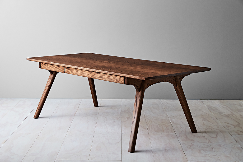 The Rima dining table is all about dramatic looks and versatility.An accentuated leg angle combined with an organic heavily shaped end rail provide the dramatic look. Six drawers provide versatility, whether it is day to day cutlery, electronic devices, or old fashioned pen and paper. Rima is designed to be a functional dining table, but is equally suitable as a grand desk, with cable routing options available.