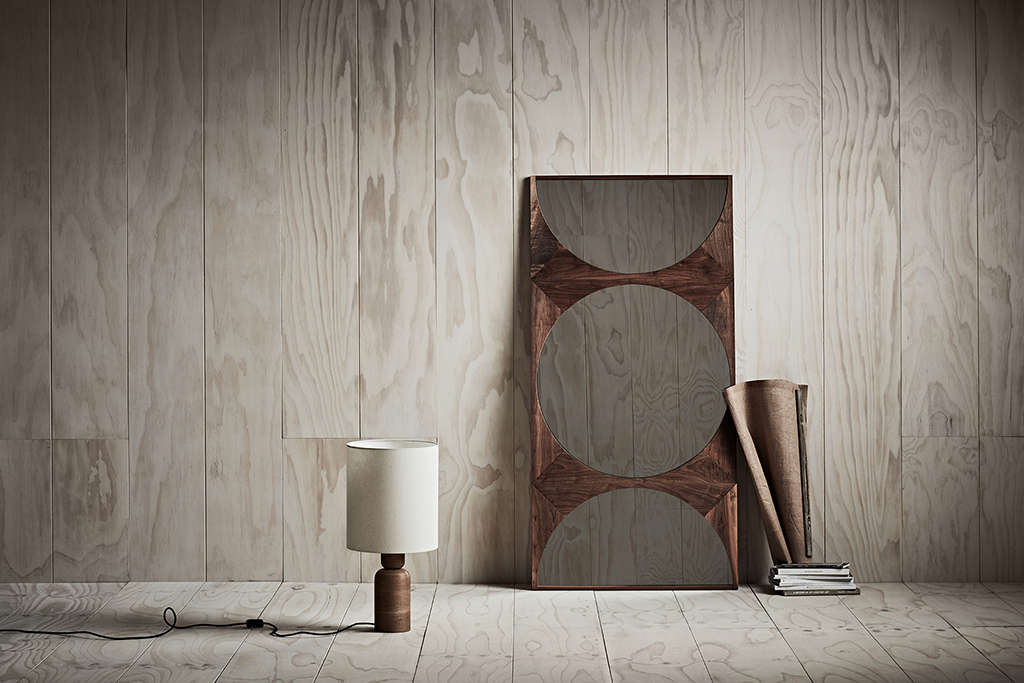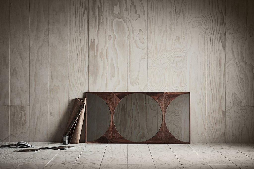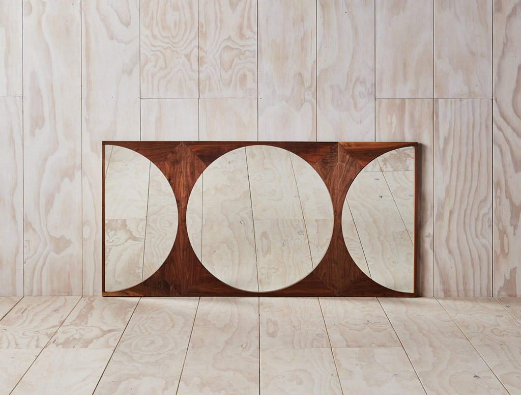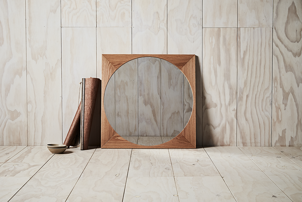 Geometric shapes and patterns define our SOHO mirror with circular mirrors and wooden panels in perfect harmony. Also available as a square frame with one round mirror.