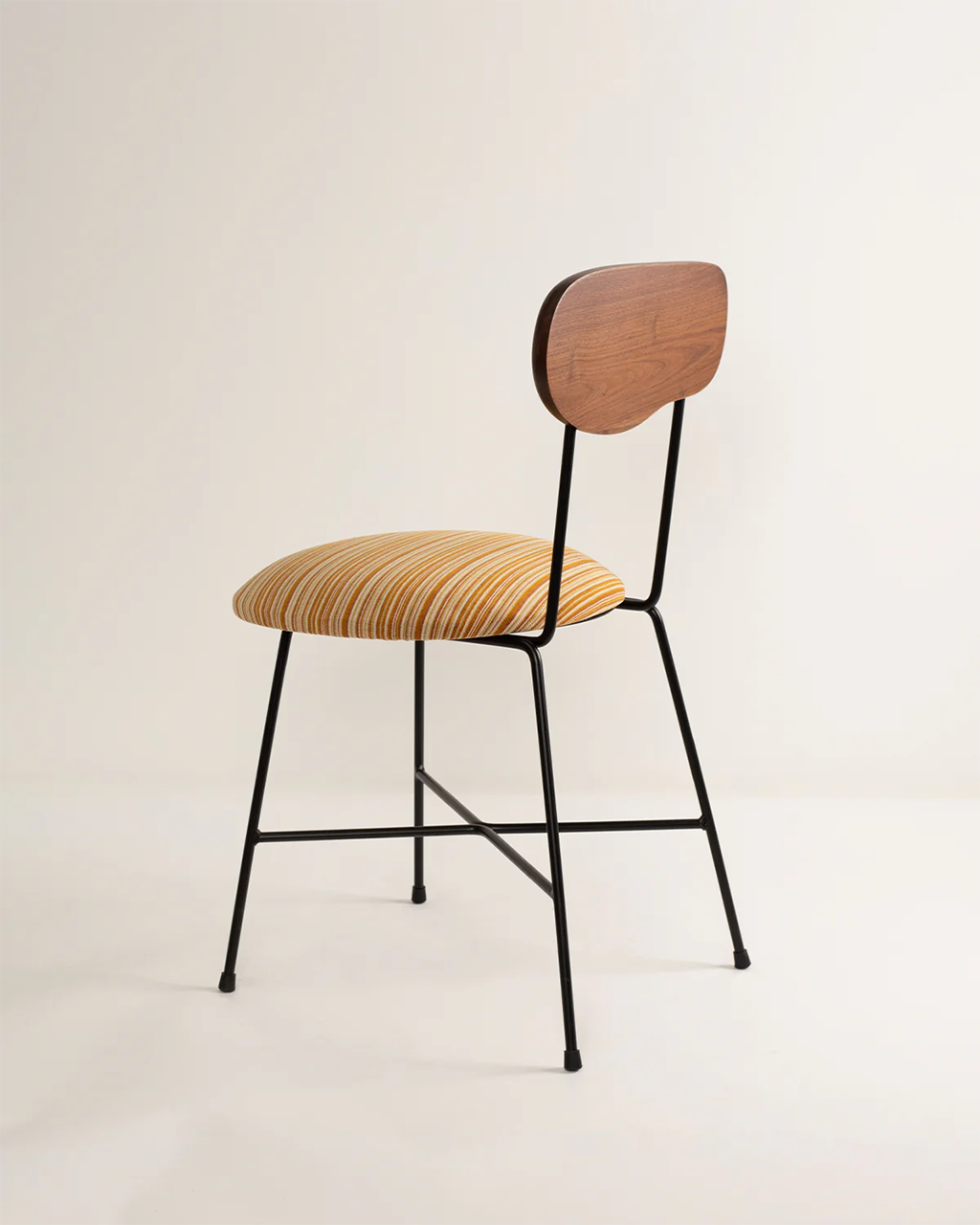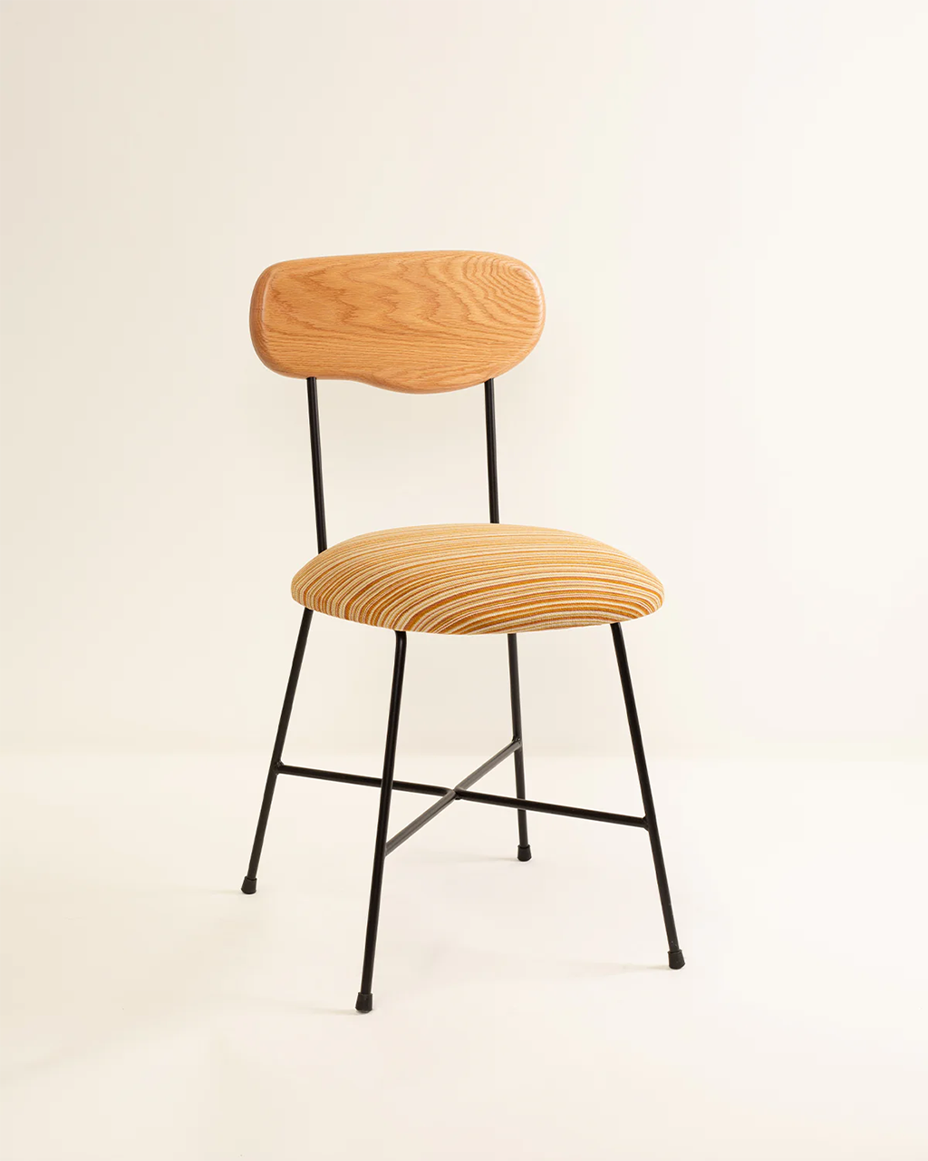 The Upholstered Pool Chair carries the motif of the Stool, where the linearity of the wire frame is interrupted by the organic wobble of the seat and backrest. The Upholstered Pool chair features a powder-coated frame and timber seat and backrest.